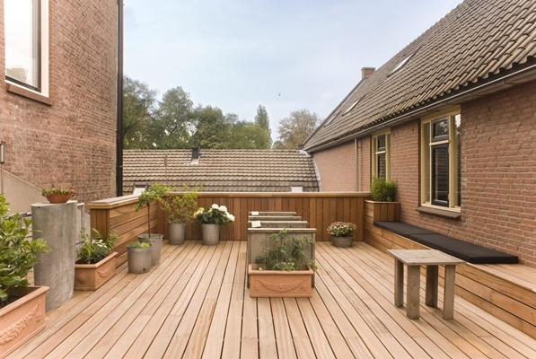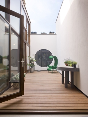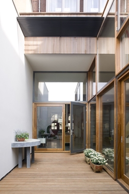 Door de nieuw ontwikkelde bovengelegen appartementen en hun bijbehorende dakterrassen zijn er daklichten van de gymzaal dichtgezet. Om weer meer daglicht in de woning te krijgen is er een patio toegevoegd die voor meer daglicht zorgt en het woongenot verhoogd. Door het relatief smalle “kavel” was het ook een uitdaging daglicht in de slaapkamers te krijgen. Ook hierbij hielp de patio. Ter plaatse van de oude achtergelegen kleedkamers zijn twee kinderkamers gerealiseerd met een eigen badkamer. De kinderkamers halen hun daglicht uit de achtertuin en de andere uit de patio.