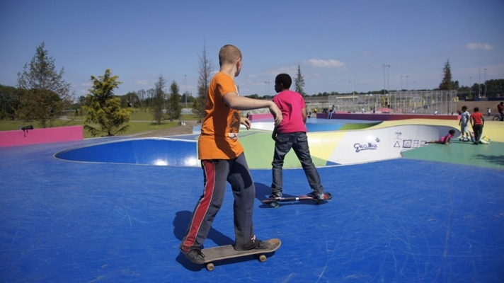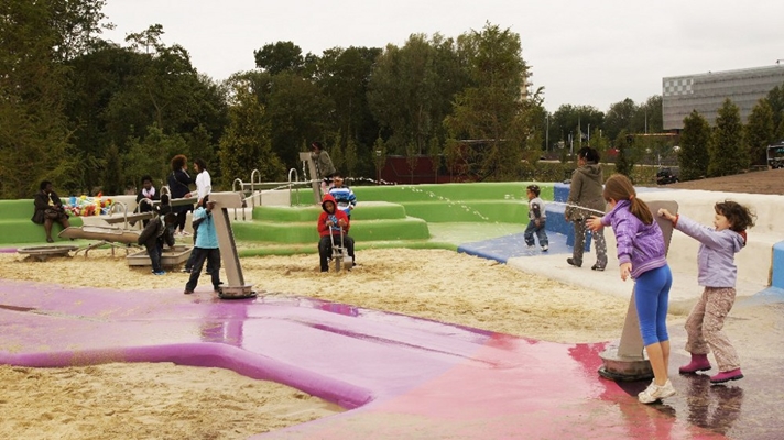 De sport- en spelesplanade in het Bijlmerpark is geopend. Deze omvangrijke speeltuin voor alle leeftijden is ontworpen door landschapsarchitect