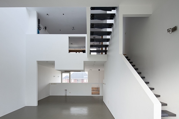 Door het introduceren van een lichtvide vanaf daklicht naar woonkamer en een split-levelverdieping (tussen 2e verdieping en dakterras) ontstaan spannende doorzichten en komt daglicht diep het huis binnen. Vanaf de slaapverdieping is er zicht op de lager gelegen woonkamer en vanaf de hoger gelegen TV-kamer kijkt de kunstenaar naar beneden in de living en kan een blik werpen naar de slaap- en badkamer. De open keuken grenzend aan de woonkamer heeft door een opengewerkte borstwering een visuele verbinding met het tweeverdiepingshoge atelier. Overal kan hoogte en ruimtelijkheid ervaren worden.