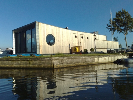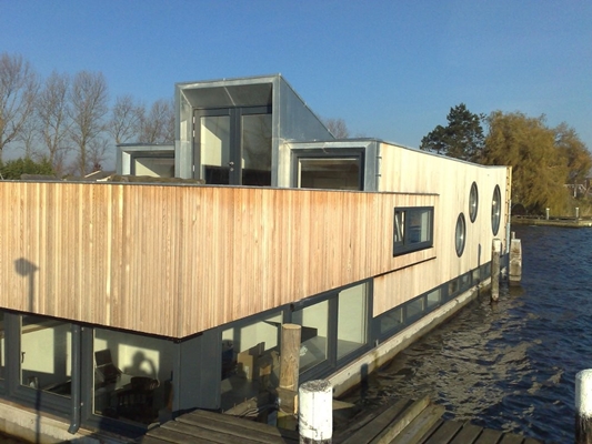 van het water, het oosten een open karakter heeft met mooie ronde ramen. De bovenbouw aan de buitenzijde bekleed met western red cedar (vellingdelen) wordt middels een glasstrook losgesneden van de drijvende onderbouw.