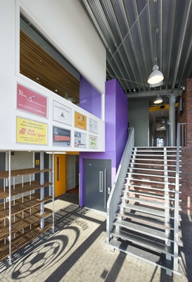 De gesloten en open gevels zijn met elkaar verweven waardoor het gebouw aan elke zijde zijn eigen architectonische expressie krijgt.