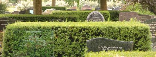 De Robinia’s langs het hoofdpad zijn de afgelopen 46 jaar uitgegroeid tot volwassen bomen en maken het pad tot een statige entree. Om de grafkamers staan losgroeiende heesterhagen die de strakke belijning van het ontwerp verzachten. Deze heesterhagen schermen tevens de graven af van het hoofdpad. In combinatie met strak geschoren hagen heerst daardoor overal een intiem karakter, ondanks de grootte van het terrein.