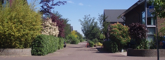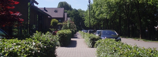 Er is geen onderscheid gemaakt in rijbaan en trottoir, de bestrating ligt op één niveau, wat de suggestie wekt van een erf.