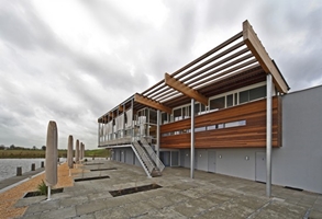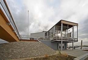 Dit jachthavengebouw is strategisch geplaatst aan het fietspad dat flauw oploopt vanaf de Noord IJsseldijk en over de Hollandse IJssel gaat via een nieuw aangelegde brug. Het gebouw omvat een deel van het dijklichaam waarover het fietspad loopt, waardoor het