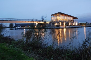 Pleisterplaats Marnemoende ligt aan een bocht van de Hollandse IJssel. Vanuit het opgetilde, glazen restaurant of het zwevende houten terras kan de bezoeker genieten van de ondergaande zon. Het gebouw is letterlijk verweven in het jachthavengebied doordat het deels is ‘ingegraven’ in het grondlichaam van de naastgelegen fietsersbrug, van waaruit het gebouw te bereiken is.