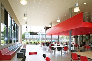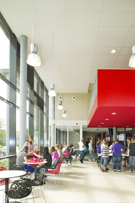 De aula heeft een mooi uitzicht over het aangrenzende polderlandschap door de royale glaspuien, daarnaast is veel hout toegepast en zijn enkele rode accenten aangebracht in de vorm van een zitelement en een keukenvolume. In de aula is een entresol aangebracht voor zelfstudie en een podium, deze loopt door naar buiten.