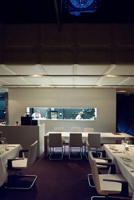 Liong Lie: “Het uitgangspunt was een maritiem getint restaurant gericht op de bovenkant van de markt. Het pand was ontworpen als functioneel ding. De contrasten – rauw van buiten en glad van binnen – heb ik in het ontwerp vertaald. Het interieur moet een brede, eigentijdse doelgroep aantrekken zonder een klassiek publiek af te stoten.” Lange zichtlijnen zorgden voor overzicht en uitzicht. Nisjes realiseerden intimiteit. Bij de materiaalkeuze hield Liong rekening met zowel het visuele als het voelbare effect. In het ontwerp is leer, blauw glas en corian verwerkt. De open keuken heeft omlijsting van wit corian en een donkere achterwand waardoor de koks in een theater lijken te staan. De wanden werden voorzien van een akoestisch leemstuc met een parelmoer effect die schitteren als de zon erop schijnt. Op het plafond zorgen lederen gecapitonneerde panelen voor een akoestische demping. De kroonluchter lijkt te draaien door de computergestuurde verlichting die in sterkte toe en afneemt. Een knipoog naar een vuurtorenlicht. ’s Avonds wekken de grote verlichtte glazen erkers nieuwsgierigheid op bij voorbijgangers.