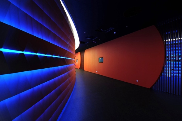 De foyer is volgens concept fire ontworpen waarbij curven in wanden en lichtstroken in plafond zijn toegepast