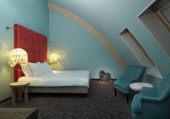 In het gebouw worden de hotelkamers gescheiden door een lange gang over de gehele lengte. Aan beide uiteinden van de gang bieden hoge ramen een mooi zicht op nieuw aangelegd groen en weilanden met sloten en knotwilgen. In het interieur zijn de zichtbare dakspanten met een witte beits behandeld. Ze dragen bij aan het ‘boerderijgevoel’ dat in de inrichting tot in detail is doorgevoerd. Voorbeelden daarvan zijn het gebruik van meubilair van grof hout, tapijt met patronen van onder meer een plankenvloer en een bloeiend weiland en vele speelse verwijzingen naar het buitenleven. Voor de inrichting van de hotelkamers zijn vier verschillende concepten gebruikt met als overeenkomst een bont en eigenzinnig kleurgebruik voor vloer en wand, badkamers die met een glazen wand van het slaapgedeelte gescheiden zijn en alle comfort waaraan een viersterrenhotel dient te voldoen.