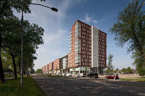 Aansluiten op stad en straat Na eerdere ontwerpen voor de Prins Bernhardlaan leefde bij gemeente Haarlem afdeling stadsontwerp de wens om deze oostelijke ringweg vorm te geven als stadsautoweg. De Flank en de Spits vormen het eerste nieuwe deel van de flankerende bebouwing aan de westzijde. Door de ‘Amsterdamse’ stoepen van de stadswoningen, de overstekende appartementen en de duidelijk herkenbare portiekentree ’s ontstaat op maaiveldniveau ondanks de forse maat van het totale blok een plint met een menselijke maat. De in de betonkaders opgenomen ventilatieroosters van de 100% natuurlijk geventileerde parkeergarage verraden nauwelijks dat hier 102 auto’s geparkeerd staan. Door de hoge ligging van de beletagevloer kijken de bewoners van de stadswoningen over het verkeer heen en worden de nadelen van het wonen op maaiveldniveau aan zo’n drukke straat vermeden.