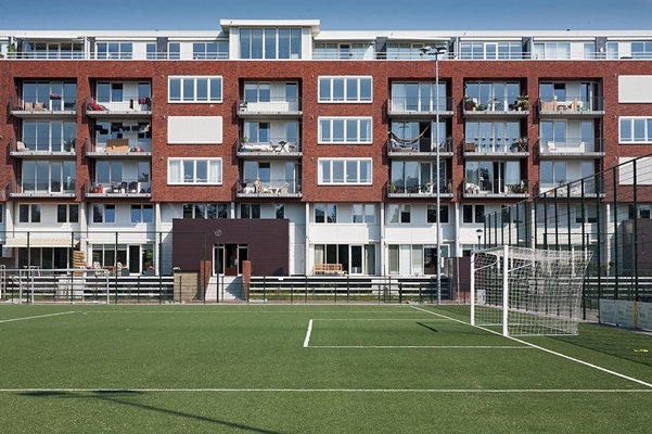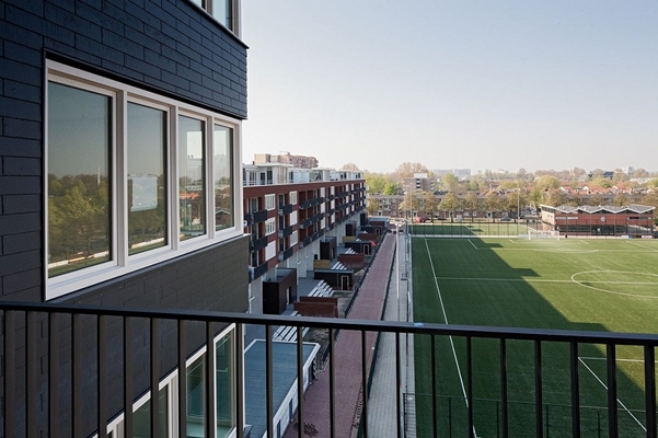 de Flank Binnen de door het parkeersouterrain gedicteerde traveemaat van 5m40 zijn boven de stadswoningen 76 koopappartementen ontworpen in 8 types. In de doorsnede is goed te zien hoe de diepere appartementen de entree en de ruime terrassen van de stadswoningen overdekken. De tribunes tussen terras en tuin scheppen samen met de verhoogde ligging voldoende afstand tot het openbare achterpad om een gesloten wand op maaiveld niveau te voorkomen. Appartementen op de 1e verdieping hebben een beschut gelegen balkon van minstens 10 m2. Voor de set back van de penthouses op de 5e verdieping liggen tot 10m brede dakterrassen. De set back zorgt voor een schaalverkleining aan de zijde van voetbalveld en de achtergelegen Nieuwe Amsterdamse buurt.
