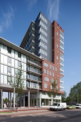 de Spits De noordgevel van de Spits vormt de zuidwand van het verkleinde van Zeggelenplein. Na realisering van een 3 a 4 lagen hoge westwand in fase 2 komt hier een meer intiem stadsplein aan de Prins Bernhardlaan te liggen. Aan dit plein ligt een vergrootte variant van de glazen portiekentree ’s in de strook. De plint van de Spits oogt door de keuze voor glas en paneelvulling hoger dan de plint van de Flank. De programmatische keuze voor transparante bedrijfsruimtes op de begane grond sluit goed aan op het omringende openbare maaiveld. De bedrijfsruimte is als een geheel of maximaal als 4 afzonderlijke ruimtes te verhuren. Om op straatniveau geen dooie hoek te maken en toren en strook los van elkaar te houden is een poort gemaakt. Aansluitend op de bedrijfsruimtes in de toren ligt hier aan zuidzijde een atelierwoning die door de grote glasvlakken bijdraagt aan de sociale veiligheid. De plattegronden van de 4 woningen per laag zijn in principe gelijk. Door de verschillende posities van de buitenruimte ontstaan verschillen die aansluiten op de oriëntatie. De opzet van de woningen voor begeleid (samen)wonen op de 1e t/m 3e verdieping is in principe gelijk. In verband met de begeleiding zijn deze 2 persoons woningen onderling te koppelen.