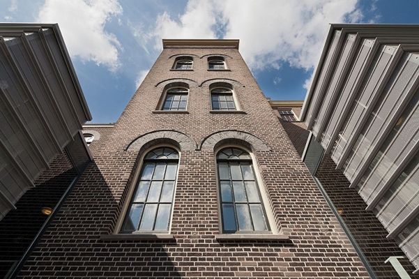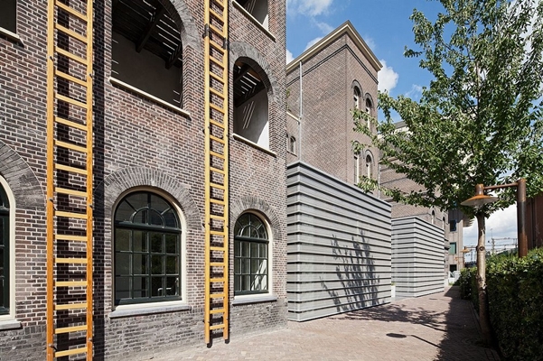 ONTWERP Bij het ontwerp diende het karakter van een vrijstaande burcht te worden behouden. Na variantenonderzoek is de noodzakelijke uitbreiding aan de achterzijde tussen het hoofdtrappenhuis en de zijrisalieten geplaatst. Hiermee wordt voortgeborduurd op de diverse uitbreidingen van vlak na de bouw. Ter wille van de architectonische duidelijkheid is ervoor gekozen om deze bescheiden uitbreidingen vorm te geven als abstracte volumes. De volumes zijn evenals de entresolvloeren los gehouden van de bestaande monumentale metselwerkgevels. Geperforeerde aluminium gevelbekleding levert aan de buitenzijde het gewenste anonieme karakter op en vormt tevens de vaste zonwering van de op het zuiden georiënteerde gevels. De oorspronkelijke indeling is leidraad geweest bij de restauratie en transformatie. De begane grond kan in maximaal 8 afzonderlijke bedrijfsunits gesplitst worden.