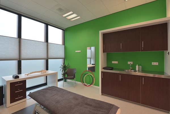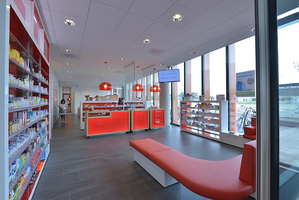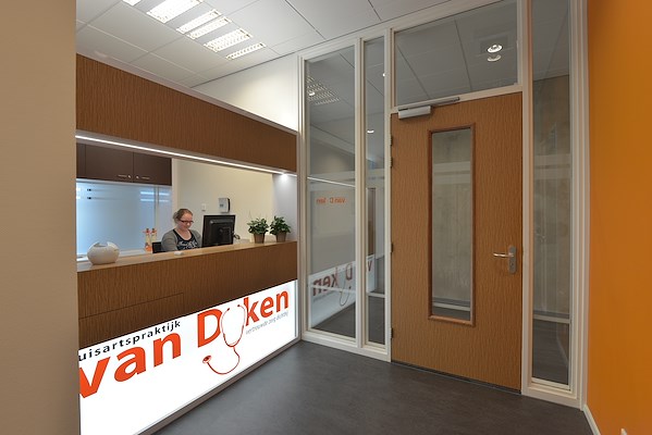 Het gezondheidscentrum is direct aan de Brink gelegen en strekt zich uit over twee bouwlagen in een ver terugliggende, transparante plint.