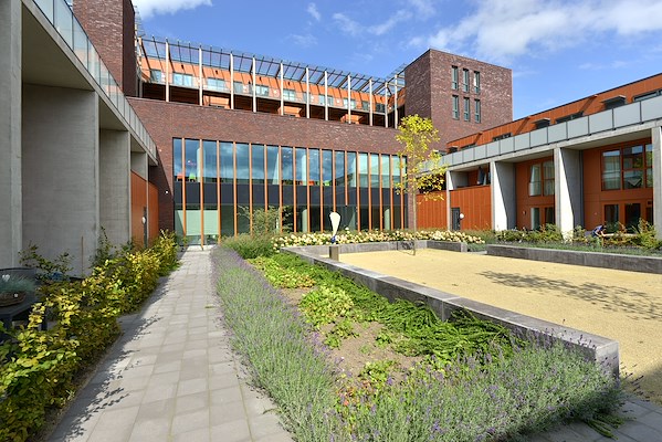 De ligging van het Kloppend Hart Huis is in onze visie nadrukkelijk onderdeel van het woonprogramma. De groene Brink, waaraan het Kloppend Hart huis is gelegen, wordt door een transparante entreehal over twee bouwlagen en de volle diepte van het volume verbonden met de besloten, zonovergoten en groene binnentuin. De hof vormt een collectieve tuin die uitnodigt tot ontmoeten. Door deze koppeling van het gezondheidscentrum met de binnentuin kunnen meer functies op de zon en het daglicht worden georiënteerd.