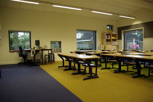 We zijn uitgekomen bij het recent door Interface ontwikkelde X-loop tapijt. Zij hebben voor ons een special gemaakt voor ongeveer 600 m², waar de klaslokalen mee zijn bedekt. De gelegde banen van gele, groene en paarsblauwe tapijttegels uit de X-loopserie sluiten naadloos aan op de stroken marmoleum die in de rest van de school liggen.