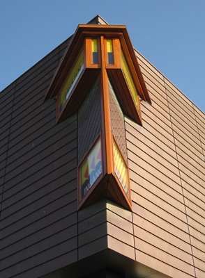 Voor de plint van het gebouw aan de zijde van de stad werd aansluiting gezocht bij de detaillering van de paviljoens in de winkelstraat. In de gevel is een lijnenspel aanschouwbaar van diepe negge en hoge houten kozijnen. De erkers aan de gevels zijn bedoeld om donjonachtige uitbouwen te maken van waaruit men over de gracht kan kijken. Deze zorgen voor een verlevendiging van het gebouw en een verankering in zijn omgeving.
