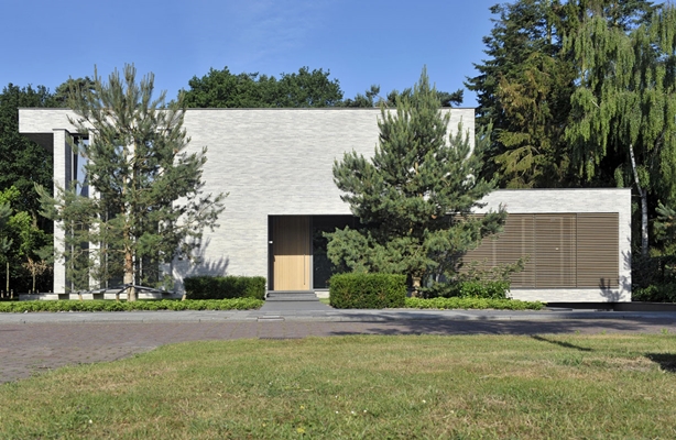 De sculpturale villa is opgetrokken uit afwisselend lange smalle handgemaakte lichtgrijze bakstenen en glas in aluminium frames. De voorgevel aan de straat is verlaagd om een zekere geborgenheid te creëren. Daarachter bevindt zich de hoge entreepartij met een machtige houten deur die scharnierloos open lijkt te zwaaien in de langgerekte glazen entreewand. Aan de achterzijde van het huis bevindt zich het inpandige zwembad. De buitenruimte wordt naar binnen getrokken door de overgangen bijna onzichtbaar te maken. Het onderkelderen van de villa voorkomt parkeren naast of voor de woning. De tuin omlijst de lichte sculptuur waar het licht aan alle kanten naar binnen schijnt. Dit is het thuiskomen waar de opdrachtgever het over had.