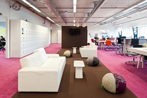 In de basis is ervoor gekozen om in het van orgine harde en afstandelijke gebouw een zachte en nieuwe laag toe te voegen als drager: tapijt in de kleuren rood, aubergine en fuchia. Daar tegenoverstaat het onafgewerkte plafond met alle installaties in het zicht. Tussen deze twee werelden in beweegt zich de ontwerpvrijheid om alle verschillende ruimtes met hun specifieke eisen te ontwerpen.