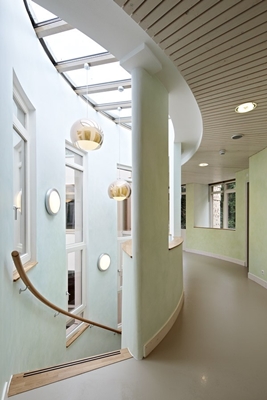 Het interieur van het Hermes Huis kenmerkt zich door veel lichtinval en lichte, natuurlijke materialen. Binnenkozijnen, vensterbanken, plinten en plafonds zijn van hout. De wanden zijn gesluierd: dmv transparante waterverf hebben de wanden zachte en levendige kleuren gekregen.