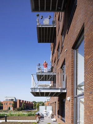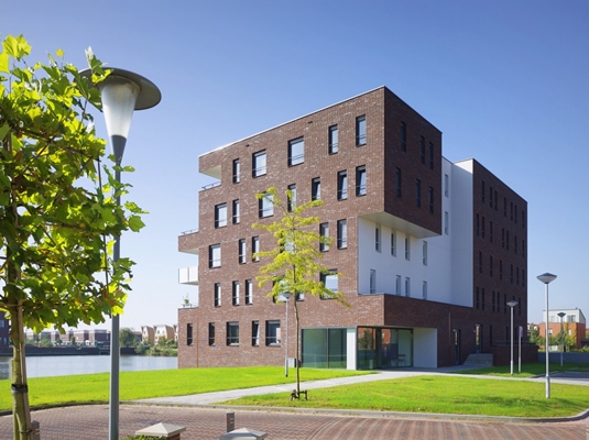 De sculpturale vormen van het bouwvolume zorgen voor een divers beeld, door het invoegen van verschillende balkons en dakterrassen. Aan de vlakke zuidgevels kragen ruime stalen balkons met trekstangen over het water. De gevel is uitgevoerd in metselwerk en gedeeltelijk gekeimd om de sculpturaliteit te benadrukken en meer licht te creëren ter plaatse van de balkons.