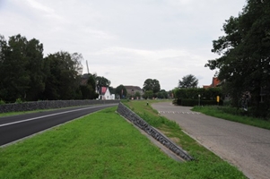 Een smalle en verdiepte rijbaan met bloeiende bermen en een opgetild grasmat met boomgroepen vormen de basis van het ontwerp. Langs de verdiepte weg staan geluidsschermen van ca. 1.50 m1. hoog. Het lage geluidscherm heeft een grondkerende functie en biedt mogelijkheden om het karakter van de omgeving te versterken.