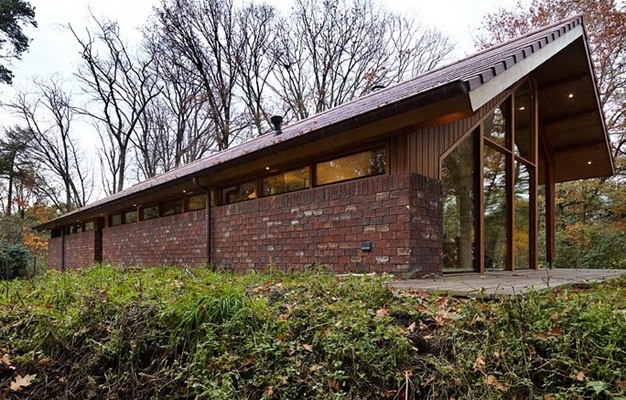 Het bos is alom aanwezig bij deze robuuste maar comfortabele boswoning, die er door het gebruik van veel hout prachtig tot zijn recht komt.