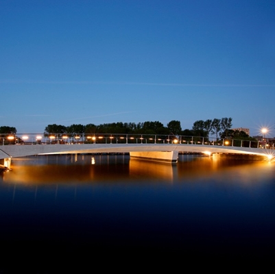 Ook ´s nachts valt de brug goed op: de randliggers met bijzondere hoekverdraaiing worden dan van onderaf verlicht. In de handregel is led-verlichting opgenomen.
