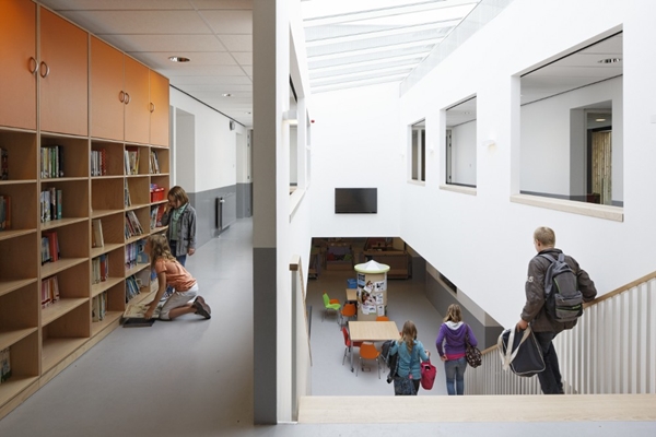 Het concept is gebaseerd op de gedachte om de traditionele gangzones te laten vervallen en alle verkeersruimte te laten samenvallen met de verblijfsruimtes: optimaal dubbelgebruik van de beschikbare ruimte! De gevraagde flexibiliteit komt tot uiting in de werkpleinen: multifunctionele vloervelden tussen de aula en de klaslokalen.