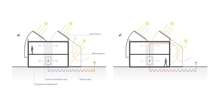 Alle huizen zijn ontworpen met speciale aandacht voor klimatologische aspecten. Zonnepanelen zorgen voor elektriciteit en een dikke, compacte isolatielaag stabiliseert het binnenklimaat. In de zomer wordt de zonnewarmte tot een minimum beperkt door gebruik te maken van een wintertuin en een grondbuis voor ventilatie. In de winter wordt dezelfde wintertuin en grondbuis gebruikt om het huis te passief te verwarmen. Dit heeft geresulteerd in een energie-positieve wijk die elektriciteit levert aan aangrenzende gebouwen.