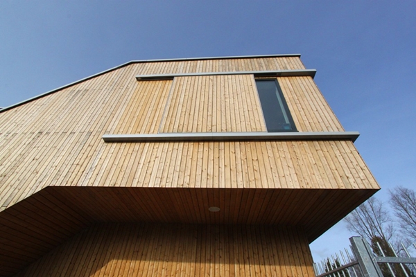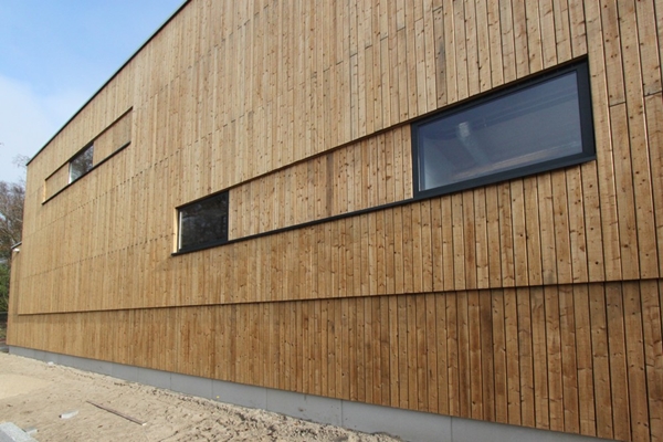 De expressie wordt waar nodig versterkt met subtiele sponningen in de grotere, houten gevel vlakken alsook in de rechthoekige vlakjes naast de kozijnen. Door houten schuifluiken voor de ramen te laten schuiven lijkt het gebouw te leven; het gebouw ontluikt met het ochtendgloren. Bovendien is de zonwering hiermee duurzaam geïntegreerd.