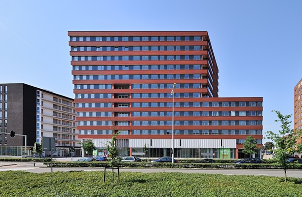 Blok B is een gesloten bouwblok met een opklimmend volume. De straatgevels volgen de bestemmingsplanlijn. Omdat de twee buurblokken aan de Amsterdamseweg niet met hun voorgevels op één lijn liggen, is gekozen om onze gevel te laten roteren. Hierdoor volgt onze dakrand de gevellijn van buurblok A en volgt onze beganegrond de gevellijn van buurblok M. Door deze rotatie ontstaat een bijzondere straatgevel, waarvan de bovenliggende verdieping steeds iets uitkraagt ten opzicht van die eronder. Hierdoor wordt het woonoppervlak van de woningen, naarmate deze hoger liggen, groter. Het opklimmende volume is het laagst aan de zuidkant. Hierdoor is de bezonning, van de op het binnengebied georiënteerde woningen van het gesloten bouwblok, optimaal. Het bouwblok heeft de grootste hoogte aan de Amsterdamseweg. Dit volume is aan de noordzijde afgeschuind, om van de toren nog meer een optisch stedenbouwkundig accent te maken. Uitgangspunt van de supervisor voor de Amsterdamseweg zijn accenten op één lijn. Om de accentwerking te versterken zijn verticale openingen bepaald in de toren. Deze hebben vormovereenkomsten met de beide buurblokken. Blok B heeft een groenhof en groendaken op de laagbouw, welke fungeren als zichtgroen voor de woningen in de toren.