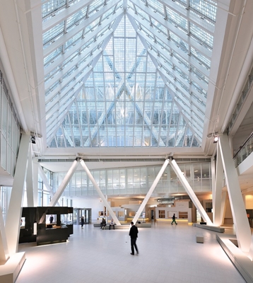 De Gemeente Den Haag streeft naar een transparante organisatie. In dit nieuwe stadskantoor wordt het contact zowel naar de buitenwereld als binnen de organisatie versterkt door de driehoekige opzet van het gebouw. Doordat de werkplekken in een open kantoorconcept rond het atrium liggen, hebben medewerkers zicht op elkaar en op andere afdelingen. Door de hoeken van de driehoeksvorm open te breken ontstaan op elke afdelingsvloer bijzondere plekken met zicht naar buiten. Op iedere etage ligt een rondgaande wandelgang, waarmee informeel contact tussen medewerkers en ook tussen verschillende afdelingen gestimuleerd. Deze centrale gangen zijn regelmatig voorzien van trappen, waardoor ook verticale circuits ontstaan. In het Stadskantoor Leyweg wordt op inventieve wijze een resultaat verkregen dat expressief van vorm is, ruimtelijk verassend, flexibel en functioneel en waarin bovendien de logica van duurzaam bouwen optimaal is ingezet.