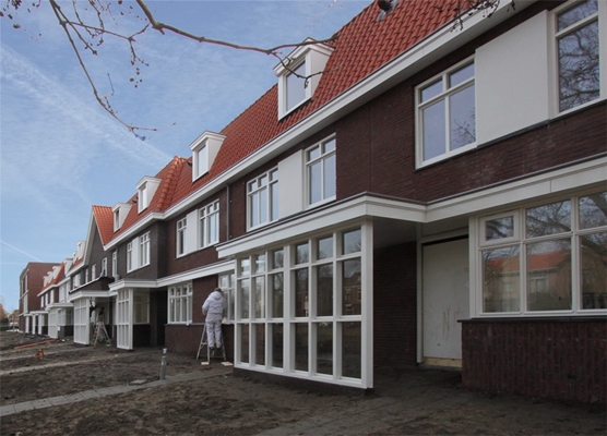 Essentiële ontwerpdetails hebben we evenwel terug laten komen in de zich conformerende woningbouw .De witte stucwerk penanten zijn hier een voorbeeld van.