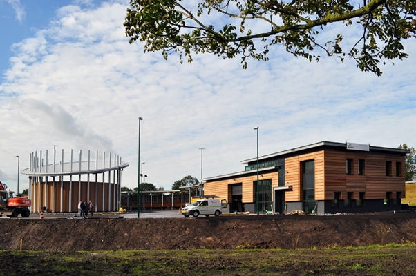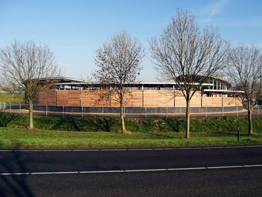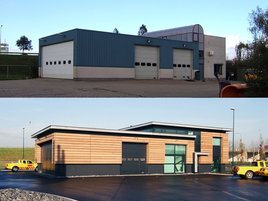 Een trapsgewijze positionering van vier gebogen verzinkte dakschijven, meelopende met het aangrenzende talud, vormen de basis voor de stalling. Door gebruik te maken van de hoogte, wordt ruimte geboden aan de verschillende stallingsbehoeften. De gesloten buitenzijde beschermt het materieel, en de open binnenzijde met radiale stallingsmogelijkheid vergroot het gebruiksgemak. Als duurzaam alternatief voor leidingwater wordt het op de dakschijven verzamelde regenwater gebruikt in de natzoutinstallatie.