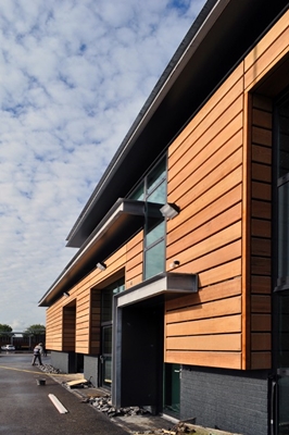 Een nieuwe gevel, uitkragend op het bestaande bouwvolume, voorziet het gebouw van een hogere isolatiewaarde en vergroot de plasticiteit in het gevelbeeld. Waar de werkplaats en de kantoorfuncties elkaar ontmoeten, overlappen de dakschijven en is de kantine, als gemeenschappelijke ruimte, gesitueerd. Een vide verbindt de twee verdiepingen en zorgt voor transparantie tussen de werkvloer en het bureaublad. Een verdiepingshoge pui tussen de kantine en de werkplaats versterkt dit effect.