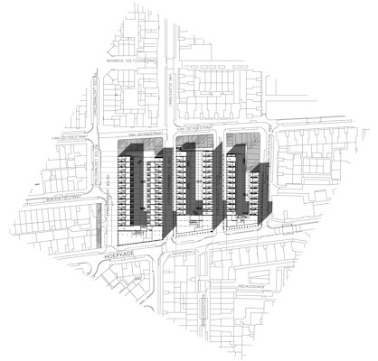 Voor de hoofdopzet van het ontwerp van de Hof van Ostade heeft HVE architecten zich laten leiden door het oorspronkelijke negentiende eeuwse stratenpatroon en de bijbehorende gesloten bouwblokken. In de verschijningsvorm van de bouwblokken wordt een hiërarchisch onderscheid gemaakt tussen hoofdstraat en zijstraten. Deze straten verschillen totaal van karakter en dit wordt in het plan onderstreept door het programma, de bouwhoogte en een subtiel verschil in materiaalgebruik. Aan de Hoefkade zijn op de begane grond winkels gesitueerd met daar boven drie verdiepingen van appartementen. Door middel van een arcade is er een overgangszone gecreëerd tussen winkels, entreehallen en de hectiek van de drukke Hoefkade. Aan de veel rustigere zijstraten van de Hoefkade zijn drie- en vierlaagse grondgebonden woningen gerealiseerd, die aan een besloten binnenterrein liggen.