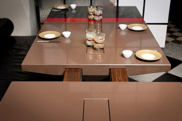 Het Silestone® blad is het hart van de tafel die qua vormgeving is geïnspireerd op de ouderwetse kloostertafel. Het Silestone® blad is samengesteld uit drie warme kleuren, te weten Doradus, Rojo eros en Gedatsu. Opvallend onderdeel van de tafel zijn de geïntegreerde units met bijpassend afdekplaatje welke bestemd zijn voor culinaire verassingen.