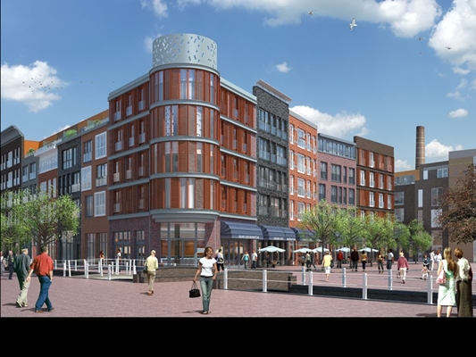 Hierdoor is een traditionele binnenstedelijke uitstraling ontstaan, met een menselijke maat. Deze uitstraling wordt nog versterkt doordat de gebouwen op een plint staan, waarin zich horeca en winkelruimten bevinden. Op de verdiepingen zijn appartementen gesitueerd.