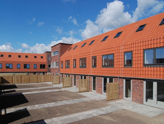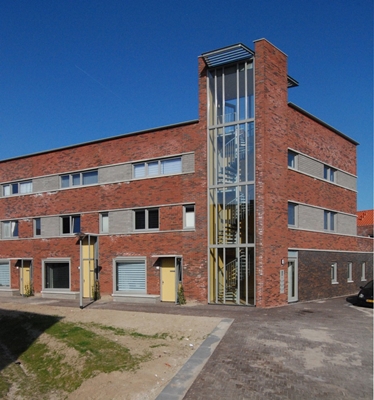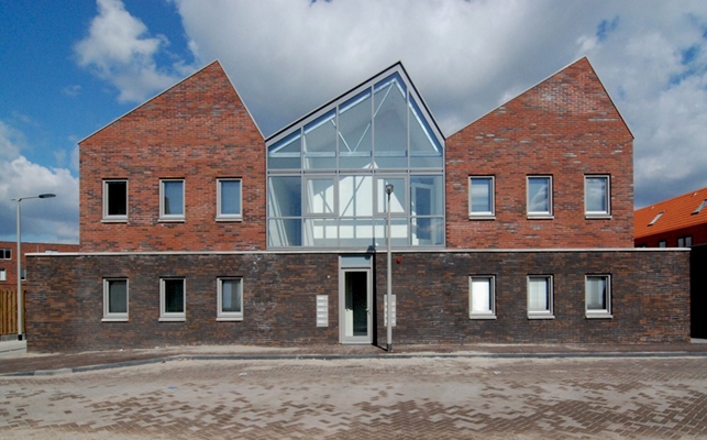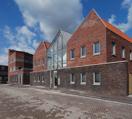 Typologie De ‘stedelijke’ voorgevel met zijn horizontale geleding heeft een tegenpool gekregen aan de achterzijde waar de sfeer dorps is door het doorzetten van de rode keramische kapvorm tot aan de begane grondlaag (een duidelijke knipoog naar het werk van Dudok). Binnen het beperkte taakstellende budget zijn er verschillende woningtypen ontworpen op basis van het Heembeton prefab betoncasco systeem. De typologie bestaat uit geschakelde gezinswoningen, hoekwoningen, ‘hoekhuis’-appartementen en RIBW (Regionale Instelling voor Begeleiding bij Wonen, Werken en Welzijn) wooneenheden. Door de gevarieerde plattegronden zijn de woningen geschikt gemaakt voor uiteenlopende doelgroepen.