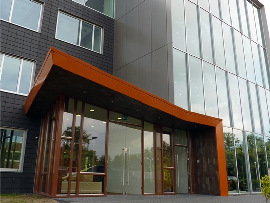 De markante nieuwe entree is een verlengde van de warme sfeervolle beleving van het interieur. Daarmee gaat de entree een mooi contrast aan het de industriële uitstraling van de gevel van het pand aan de Galileilaan. Sterke lijnen en de bijzondere toepassing van bronskleurig tegelwerk op zowel vloer, wand en plafond maken de entree een icoon van het gebouw en de gebruiker: Mooiland.