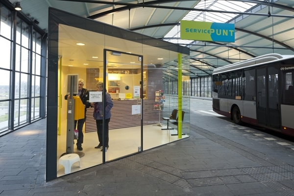 Een kiosk in de loods biedt onderdak aan een servicepunt van het OV bureau, en een eindhaltevoorziening voor buschauffeurs, en een openbaar toilet. De kiosk is vormgegeven als een abstract element, bestaand uit glasvlakken en vlakken met betonstuc. In het interieur staat een meubel welke een balie en displayfunctie bevat. Door de tactisch geplaatste glaspuien richt de in het gebouw aanwezige verkoopruimte op de aankomende treinen uit de richting van Zuidbroek, het oude stationsgebouw, en aankomende buspassagiers. De eindvoorziening van de chauffeurs is iets hoger gelegen om privacy van de chauffeurs op een druk perron te waarborgen, en richt zich naar buiten, op het toekomstige Lloyd's Terras.