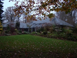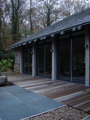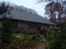 De gevels zijn gemaakt van zandsteen blokken, afgewisseld met vergrijzende houten vlakken. Deze zijn aan de noordzijde en aan de zijgevels voorzien van verhoudingsgewijs kleine ramen. Aan de terraszijde zijn de gevels vrijwel geheel van glas. De draagconstructie is gemaakt van zware inlandse eiken balken die overal in het zicht zijn gelaten en aan de zuidzijde uitsteken in een pergola. De grote, overstekende, dakvlakken zijn nergens onderbroken en bekleed met dikke natuursteen leien. Het geheel oogt als een grote lodge in het bos waarbij alles eerlijk en zichtbaar is gelaten.