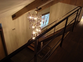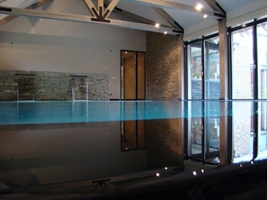 Op de begane grond zijn de woonvertrekken aan de zuidzijde geplaatst, aan de westzijde bevindt zich een 3 meter diep zwembad. Al deze vertrekken zijn hoog en hebben hoge glaspartijen, die uitkomen op het terras. Op de verdieping is een slaapkamer, wat bergruimte en veel vides. De vertrekken zijn niet groot van afmeting, maar lopen in elkaar over, soms af te sluiten met taats- en schuifwanden. De vloer- en wandafwerking loopt van binnen naar buiten door.