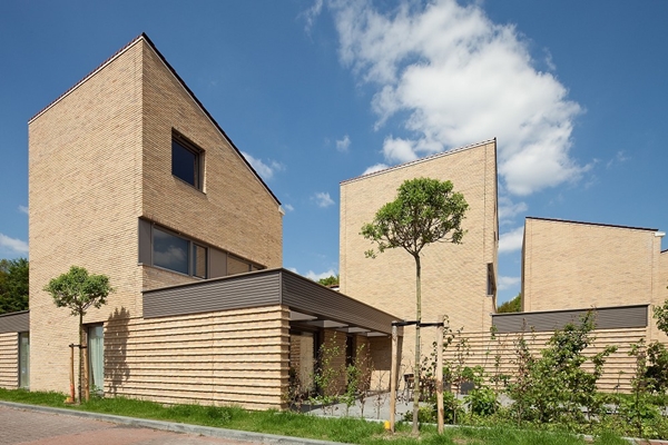 De woningen zijn gebouwd in een strakke genuanceerde gele steen en afgedekt met een bruine keramische dakpan. Door de combinatie van traditionele materialen en een strakke eigentijdse vormgeving krijgt dit gedeelte van de bosrand een geheel eigen karakter. Onverwachte woningplattegronden en doorzichten op eigen tuin en bosrand versterken dit beeld.