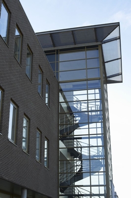 Het kantoor heeft een moderne en zakelijke uitstraling door toepassing van robuuste materialen, verdiepingshoge beglazing en een geheel glazen trappenhuis.