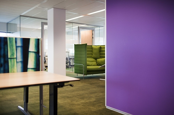 “Warm en huiselijk, dat was de opdracht die wij meekregen van Alcatel-Lucent”, aldus Arie Alderliesten. De interieurarchitect van Pw-i Karel van ’t Wout en zijn collega’s Saskia Vrolijk en Karel van 't Wout kregen carte blanche. “Wij hebben de vloerkleur gebruikt als uitgangspunt per etage. Interface biedt hiervoor een mooi kleurenpalet voor een luxe kwaliteit. Wij hebben gekozen voor sprekende kleuren als blauw, olijfgroen en dieprood. Saaie meubels uit de oude kantoren hebben wij hergebruikt door ze een bijpassende kleur te geven. Openbare ruimtes zijn aangeduid door een herkenbaar pallet van verschillende kleuren.”