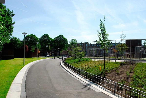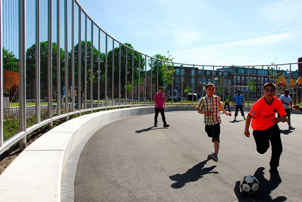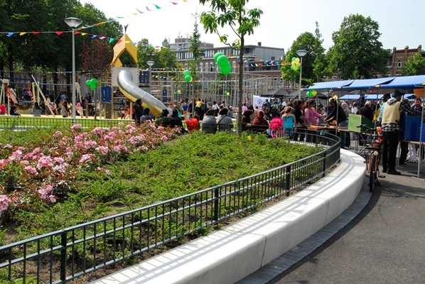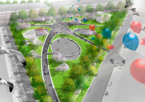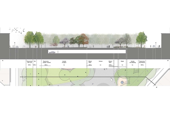 Het ontwerp gaat uit van een park-pleinhybride met naar het midden oplopende gazons, losgestrooide bomen en een strakke lindenlaan rondom. Tegelijkertijd is het een dakpark omdat er een parkeergarage onder zit, waarvan de inritten naar de garage nauwkeurig zijn ingepast. Het park bestaat uit looplijnen die aansluiten op de buurt en welke uit het gazonvolume zijn gesneden. De verknoping van deze looplijnen is vormgegeven als ontmoetingsplein met zitranden rondom.
