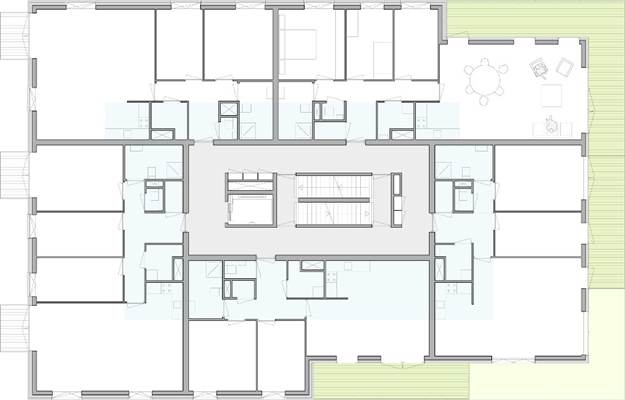 De kern in het midden van het gebouw is omringd door een eerste ring van collectieve verkeersruimtes, die toegang bieden tot de appartementen. De tweede ring concentreert alle benodigde voorzieningen voor de appartementen (toiletten, badkamers, keukens, bergingen en schachten) zodat er een derde ring ontstaat met een continue vrije ruimte, waarin de verblijfsruimtes van de woningen zijn geplaatst. Deze ring is een flexibele ruimte die op vele manieren verdeelt kan worden en zo verschillende indelingen voor verschillende levenswijzen kan bieden. De woningtypes kunnen variëren van een ruimtelijke loft tot een drie-kamer appartement. De vierde ring is gegenereerd door de buitenruimtes van de woningen, die bestaan uit de lange panoramische balkons die de appartementen aan de parkzijde omringen en de individuele balkons die de gevel aan de stedelijke gevel een willekeurig ritme geven.