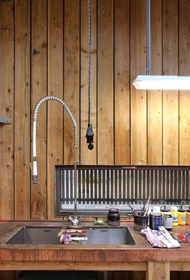 In het ontwerp is het schuifdak essentieel voor optimaal gebruik van daglicht in het atelier. Het schuifdak heeft een overspanning van 4,2 x 4,3 meter en verschijnt als een 86 mm dikke massieve koperen plaat. Aan de verandazijde loopt de kopergelaagde vloerplaat door naar buiten en is de glazen pui open te vouwen.